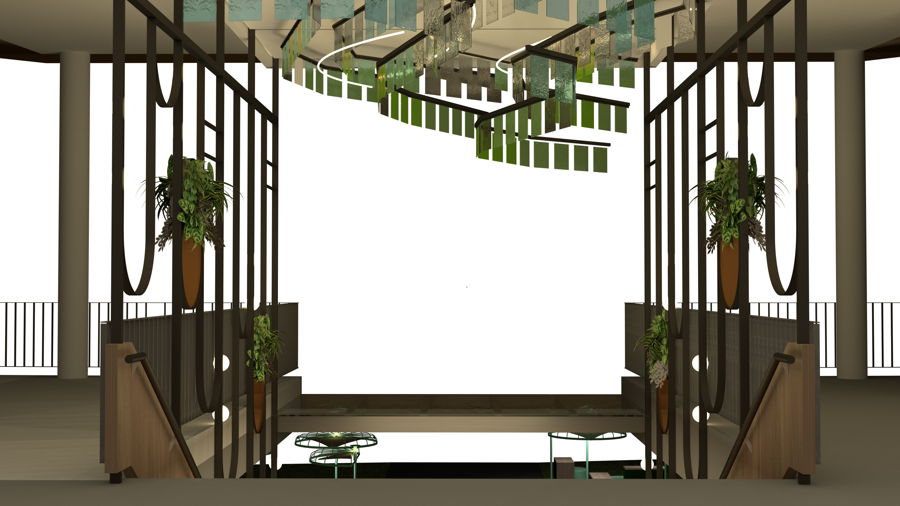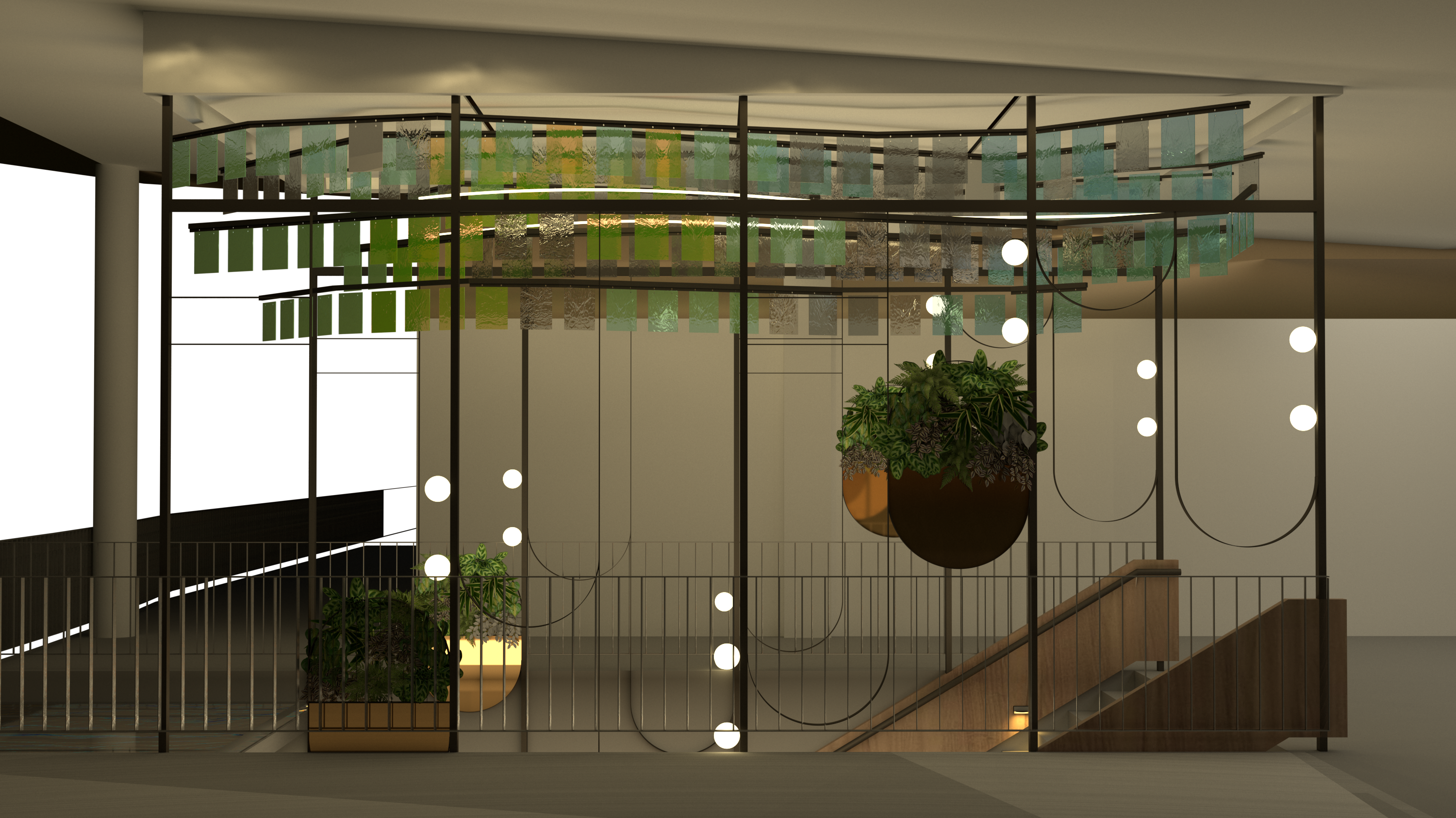 A total of 1,000 acrylic panels have been installed and concealed within the ceiling, suspended by steel rods and a structural design that ingeniously doubles as the staircase handrails.